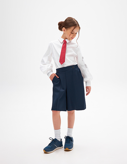 Белая школьная блузка полуприлегающего силуэта. Стильная модель из поплина. Длинный объёмный рукав с высоким манжетом. Дизайнерский принт на рукаве.