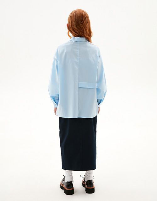 Элегантная светло-голубая блузка прямого силуэта, с утончённой лаконичной вышивкой. Комфортная застёжка на кнопки. Накладной карман. Глубокий разрез с одной стороны. Складки-защипы на рукавах. Модель выполнена из качественного поплина для комфорта и стиля.