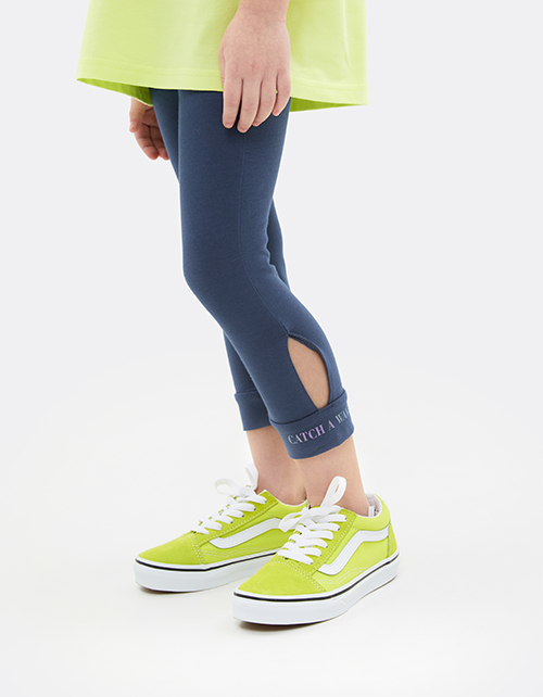 Бриджи оттенка деним для девочки. Узкая модель со средней посадкой. Изделие на мягком поясе. Манжеты по низу. Разрезы по бокам. Бриджи декорированы шрифтовыми авторскими принтами.