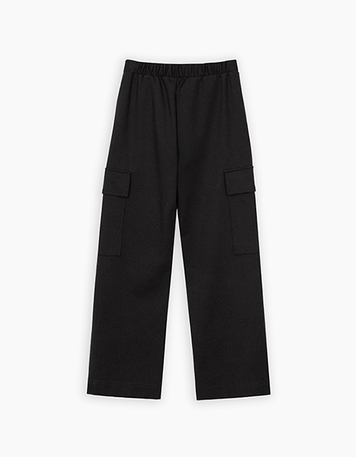 Стильные чёрные брюки карго для девочки. Прямая широкая модель со средней посадкой. Изделие без застёжки, на мягком поясе с регулировкой. Брюки с накладными объёмными карманами на клапане, декорированном лейблом.