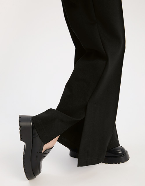 Чёрные брюки-клёш с разрезами внизу для девочки. Модель со средней посадкой. Изделие на эластичном поясе с регулировкой объёма. Брюки дополнены карманами в швах. Стильный образ с лонгсливом 252106 и свитшотом с коротким рукавом 252108.