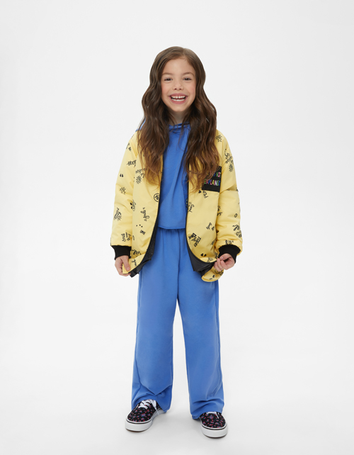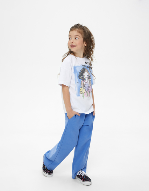 Широкие лазурные брюки с сырым срезом по низу для девочки. Средняя посадка, что делает изделие комфортным для любых типов фигур. Модель из футера с браш-эффектом декорирует надпись.