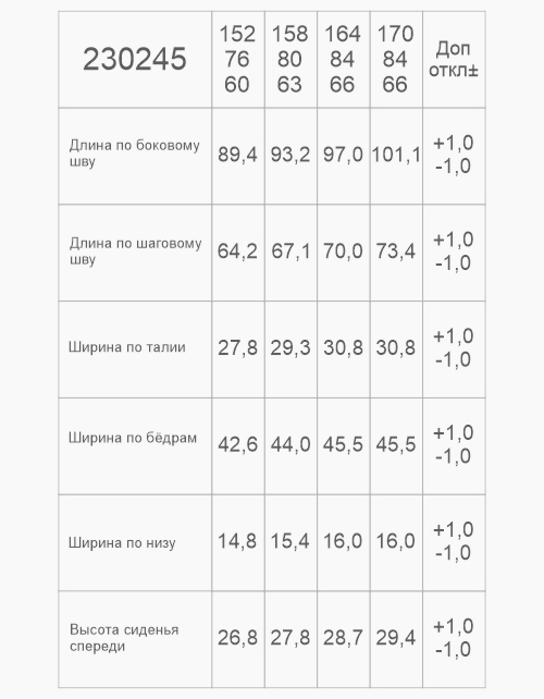 Обхват бёдер, см 61 65,8 65,8 71,6 71,6 76,6 80,7 80,7 82,8 87,6 92,4 92,4 94 94 98 98