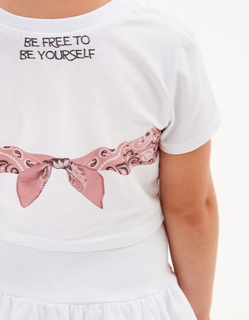 Белый топ для девочки. Укороченная модель прямого силуэта. Втачной рукав. Эластичная горловина. Футболка с авторским принтом спереди и на спинке.