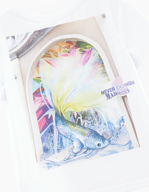 Дизайнерская белая футболка для девочки. Модель прямого силуэта. Эластичная горловина из рибаны. Футболка декорирована авторскими принтами: небольшим шрифтовым спереди и акцентным на спинке. Отличный образ с рубашкой артикул 240150.