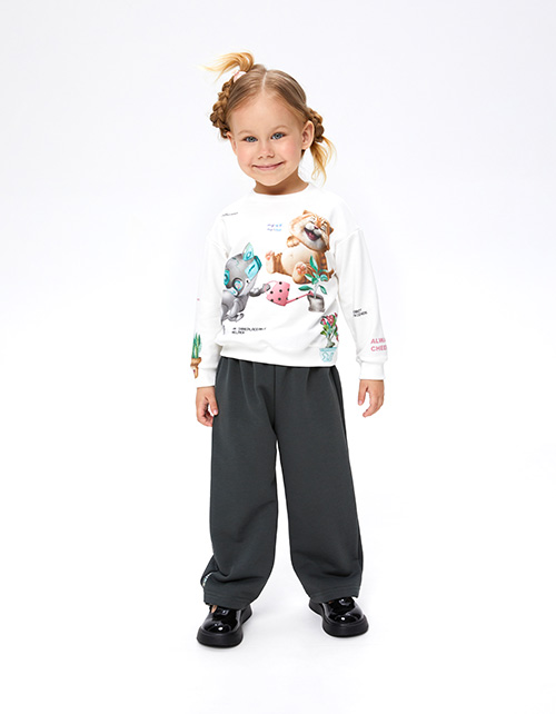Свитшот оттенка молоко для девочки. Модель прямого объёмного силуэта. Спущенная линия плеча. Воротник-стойка, манжеты и низ изделия из рибаны. Почерковая модель бренда декорирована авторскими принтами.