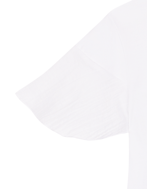 Повседневная белая футболка для девочки прямого силуэта. Короткие рукава и круглый вырез горловины. Футболка имеет отделку из плательной ткани и дополнена воланом на спинке и стильным принтом.