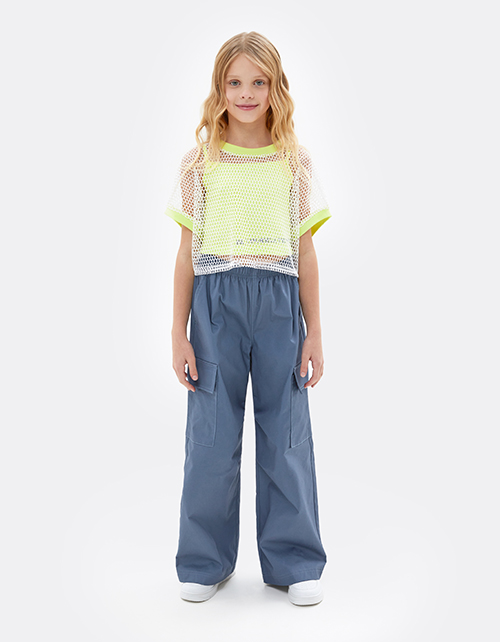 Футболка сочного оттенка киберлайм для девочки. Двойная модель: прилегающий кроп-топ из кулирной глади и объёмная укороченная футболка из сетки. Нижний топ декорирован авторским шрифтовым дизайном.