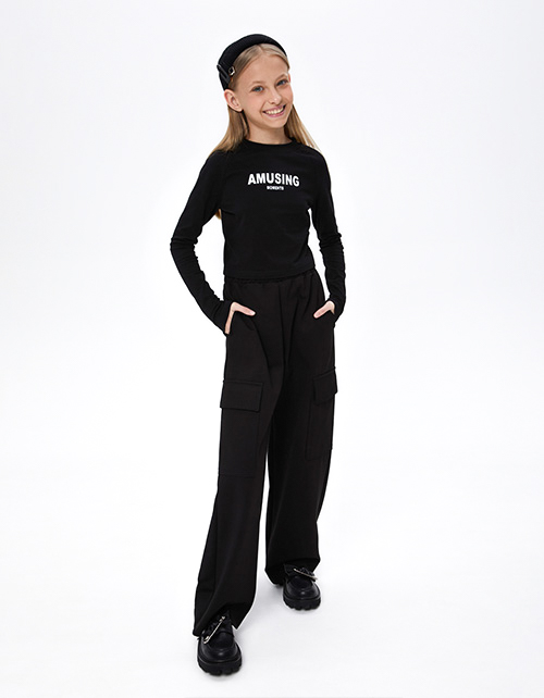 Стильный укороченный чёрный лонгслив для девочки. Модель прилегающего силуэта. Рукав реглан. Горловина из эластичной рибаны. Лонгслив декорирован авторской шрифтовой печатью.