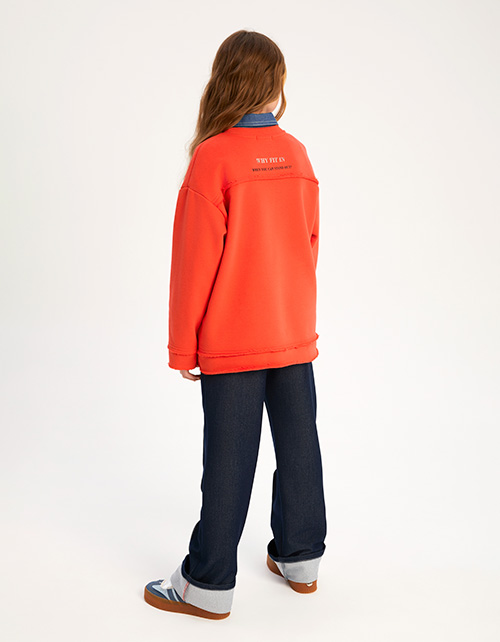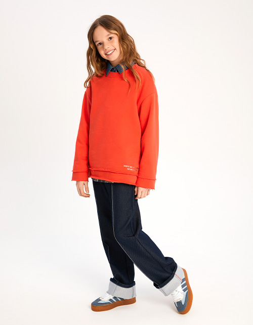 Яркий свитшот из тактильно приятного материала для девочки. Модель комфортного прямого силуэта. Приспущенная линия плеча. Горловина из мягкой эластичной рибаны. Сырой срез по низу изделия и рукавам. Застёжка на кнопки. Тактичный шрифтовой декор.