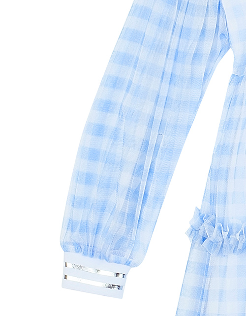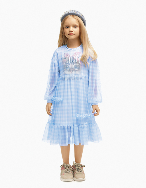 Клетчатое платье трапециевидного силуэта. Полупрозрачные объемные рукава и настрочные рюши. Трикотажная горловина и манжеты, декорированные печатью. Металлические стразы. Принты в стилистике капсулы "Event".