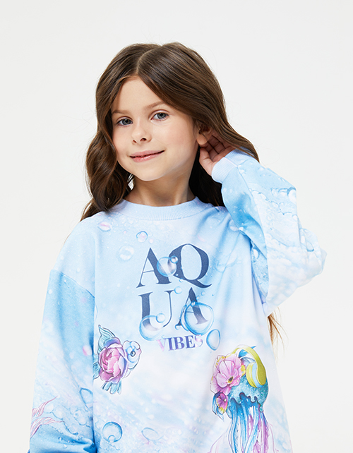 Платье-свитшот с длинным рукавом для девочки. Модель комфортного прямого силуэта, без застёжки. Спущенная линия плеча. Горловина, манжеты и низ изделия из рибаны. Платье декорировано стразами и фантазийным дизайнерским принтом.