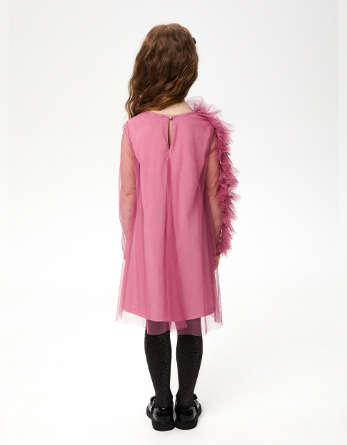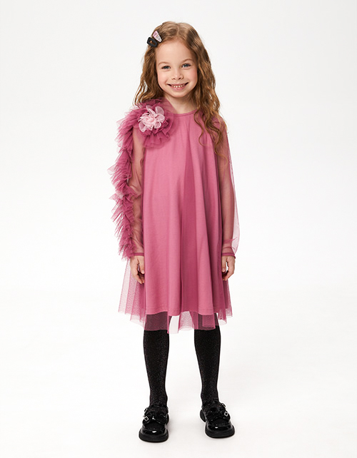 Романтичное платье тёмно-розового оттенка для девочки. Модель комфортного А-образного силуэта. Застёжка на пуговицу. Комбинация материалов: кулирная гладь и мягкое сетчатое полотно. Платье декорировано отлетными элементами из сетки по плечу и рукаву.