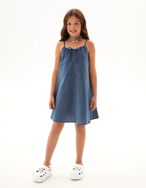 Джинсовый сарафан для девочки. Модель комфортного трапециевидного силуэта. Бретели с регулировкой. Сарафан можно носить как самостоятельно, так и в сочетании с футболками и лонгсливами, для создания интересных образов.