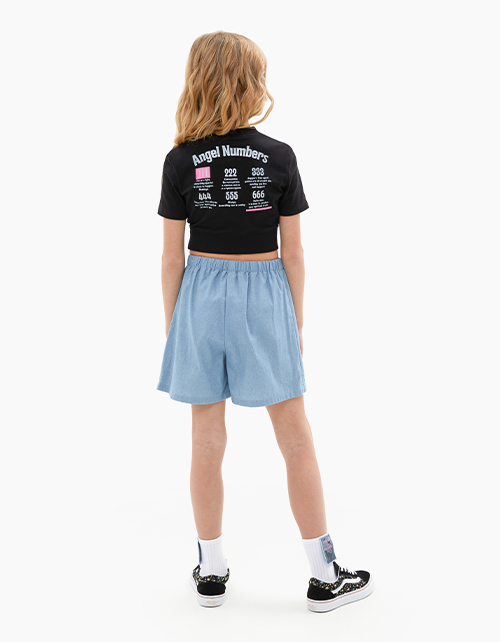 Стильная джинсовая юбка-шорты для девочки. Модель спереди А-образного силуэта, по спинке прямая. Иммитация запаха. Комфортная средняя посадка, мягкий пояс с резиной внутри. Деликатный шрифтовой принт и декоративная кнопка.