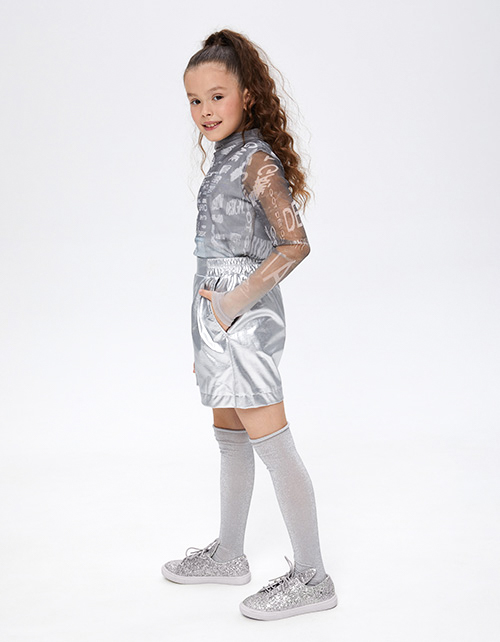 Стильные шорты из эко-кожи в оттенке серебро для девочки. Комфортная модель на эластичном поясе с наклонными боковыми карманами.