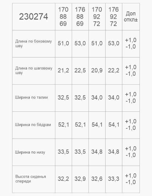 | Обхват бёдер, см | 61 | 65,8 | 65,8 | 71,6 | 71,6 | 76,6 | 80,7 | 80,7 | 82,8 | 87,6 | 92,4 | 92,4 | 94 | 94 | 98 | 98 |