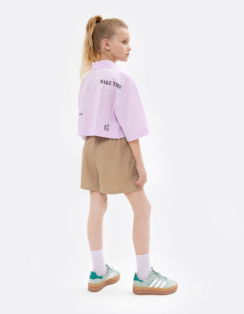 Светло-бежевые шорты для девочки. Широкая модель, расслабленного силуэта. Изделие на мягком поясе, с высокой посадкой. Шорты из лёгкого дышащего материала - лиоцелл. Карманы в боковом шве. Стильно смотрятся с любой футболкой из коллекции.