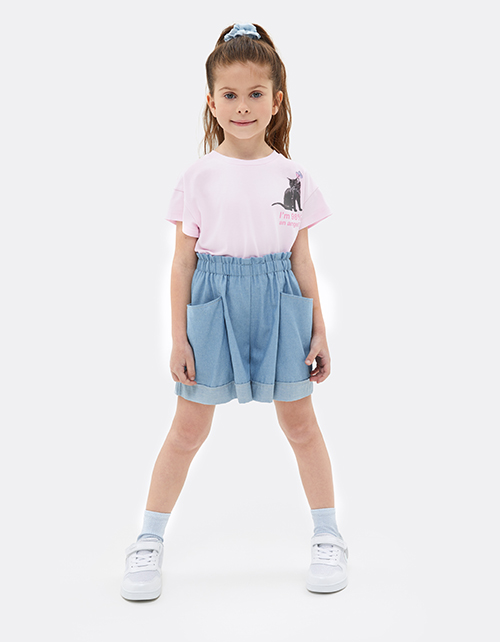 Светло-голубые шорты под джинс для девочки. Прямая модель с высокой посадкой. Изделие на мягком поясе, сверху с романтичной рюшей. Широкие контрастные манжеты (изнанка материала). Наклонные боковые карманы.