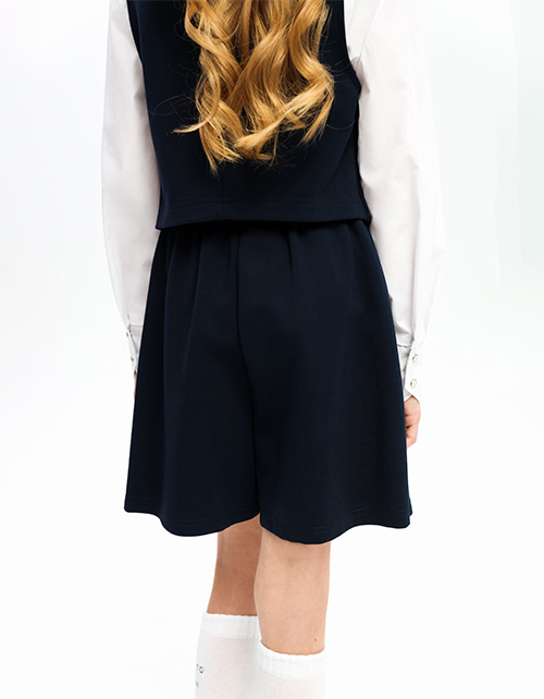 Тёмно-синяя школьная юбка-шорты для девочки. Спереди: А-образная модель с имитацией запаха, сзади: прямые шорты. Изделие на мягком поясе (внутри с резинкой), декорированным пуговицей. Шрифтовой декор спрятан под запахом, виден при движении.