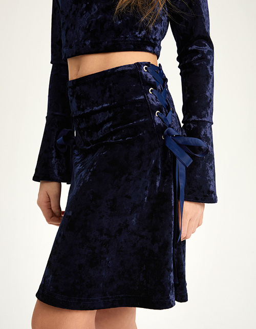 Бархатная юбка для девочки. Комфортный А-образный силуэт, декоративная шнуровка по бокам на люверсах. Тёмно-синий цвет, мягкая фактура. Удобная посадка, визуальный акцент. Подходит для особых случаев и модных выходов.