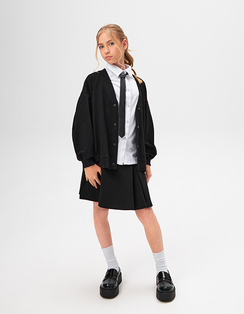 Чёрный школьный кардиган из футера для девочки. Комфортная удлинённая модель оверсайз. Изделие со спущенной линией плеча с оригинальной складкой на рукаве.