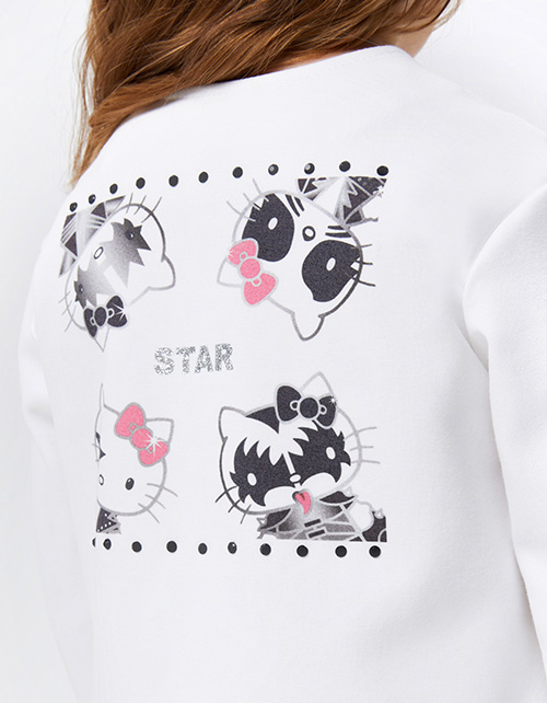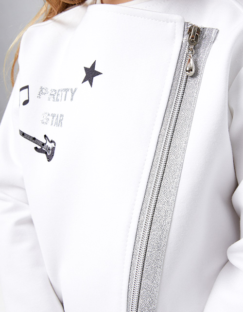 Стильный жакет-косуха молочного оттенка для девочки. Модель прямого силуэта. Застёжка на молнию. Жакет декорирован стразами и авторскими принтами: деликатным спереди и акцентным на спинке. Гармоничная пара с артикулами 242203 и 242204.