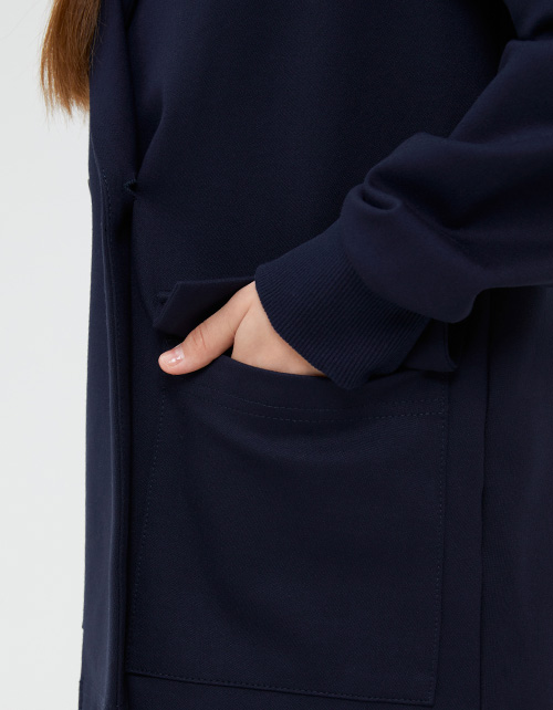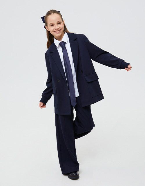 Тёмно-синий школьный жакет для девочки. Комфортная удлинённая модель прямого силуэта. Изделие с застёжкой на пуговицы. Верхний воротник и манжеты из мягкой рибаны. Накладные карманы.