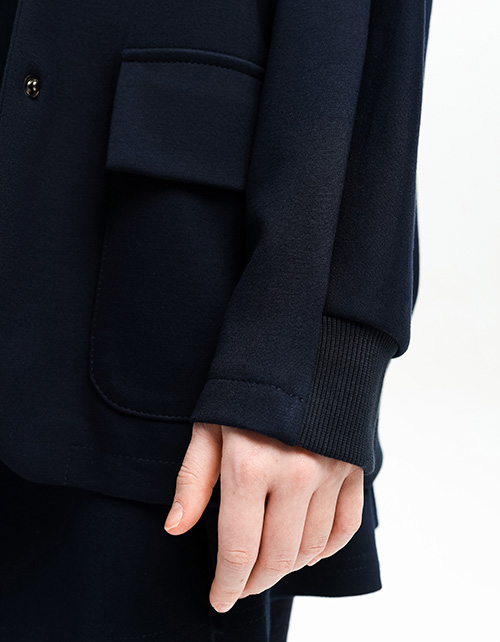 Тёмно-синий удлинённый жакет для девочки. Классические лацканы, глубокие карманы с клапаном, застёжка на пуговицы. Манжеты комбинированные с эластичной рибаной. Низ изделия сзади на резинке.