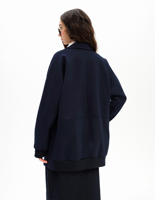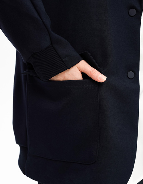 Тёмно-синий удлинённый жакет для девочки. Классические лацканы, глубокие карманы с клапаном, застёжка на пуговицы. Манжеты комбинированные с эластичной рибаной. Низ изделия сзади на резинке.