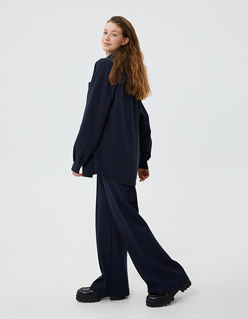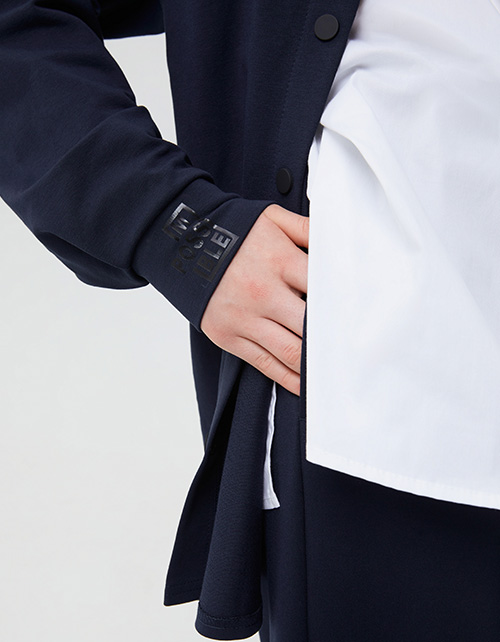Тёмно-синий школьный жакет-рубашка для девочки. Модель прямого силуэта, оверсайз. Спущенная линия плеча. Накладной карман. Комфортная застёжка на кнопки. Манжеты из рибаны, на одном - деликатный авторский принт.