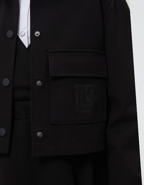 Трендовый укороченный школьный чёрный жакет для девочки. Модель прямого силуэта. Комфортная застёжка на кнопки. Накладной карман с клапаном декорирован деликатным авторским принтом. Манжеты с застёжкой на кнопку.
