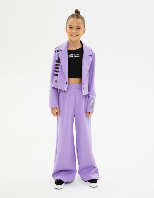 Укороченный жакет в трендовом оттенке цифровая лаванда. Застёжка на чёрную прорезиненную кнопку. Отложной воротник пиджачного типа. Изделие декорировано авторскими блестящей и матовой плёнками. Отличный образ с артикулами 240205 и 240222 или 240206.