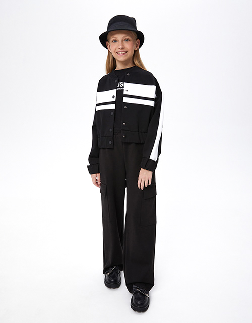Дизайнерский чёрный жакет-бомбер для девочки. Прямая укороченная модель. Низ изделия и манжеты с эластичной тесьмой внутри. Комфортная застёжка на кнопки. Бомбер спереди и сбоку по рукавам декорирован контрастными вставками.