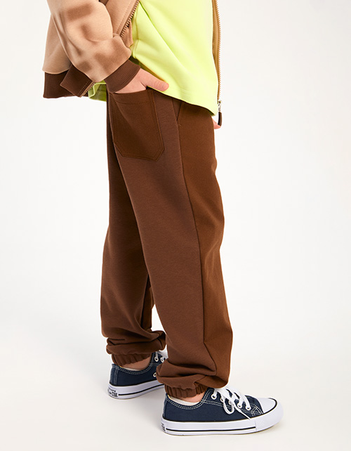 Брюки джоггеры коричневого оттенка для мальчика. Прямая модель, со средней посадкой. Изделие на мягком поясе. Эластичные манжеты на ленте. Комфортная комбинированная модель: футер и твил. Брюки дополнены карманами: боковыми спереди и накладным сзади.