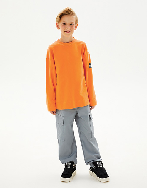 Утилитарные брюки интересного серо-зелёного оттенка для мальчика. Свободная модель прямого силуэта, со средней посадкой. Мягкий эластичный пояс и манжеты. Комбинация материалов: твил и футер. Брюки дополнены карманами-хулиганами и накладным с клапаном.