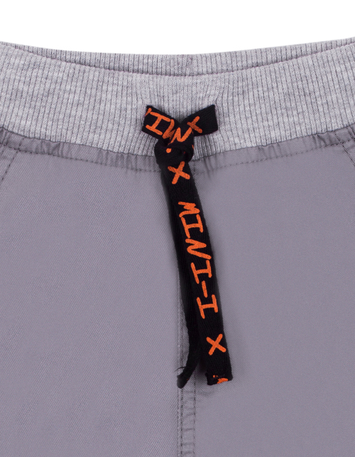 Повседневные брюки для мальчика свободного силуэта серого цвета. Пояс на резинке дополнен контрастным шнурком. Два кармана спереди и накладной карман в задней части. Изделие дополнено манжетами и стильными нашивками.