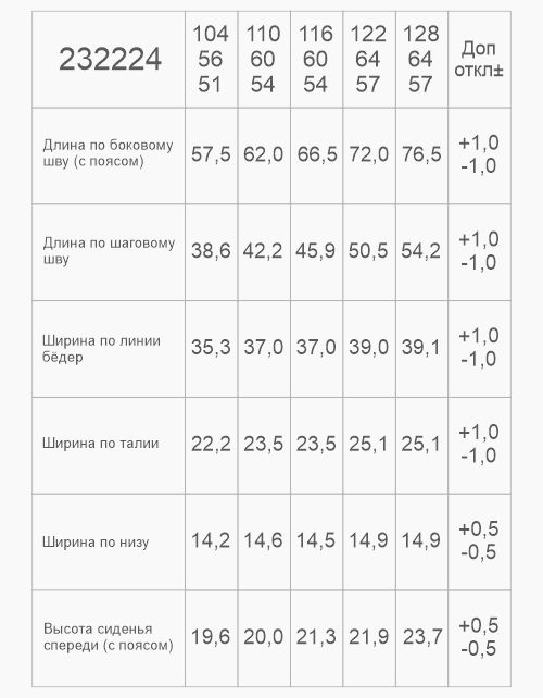 | Рост, см | 104 | 110 | 116 | 122 | 128 | 134 | 140 | 146 | 152 | 158 | 164 | 170 | 170 | 170 | 176 | 176 |