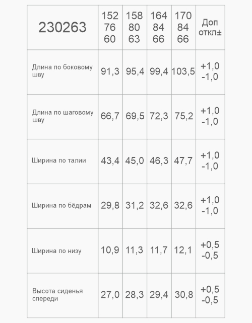 Обхват бёдер, см 61 65,8 65,8 71,6 71,6 76,6 80,7 80,7 82,8 87,6 92,4 92,4 94 94 98 98