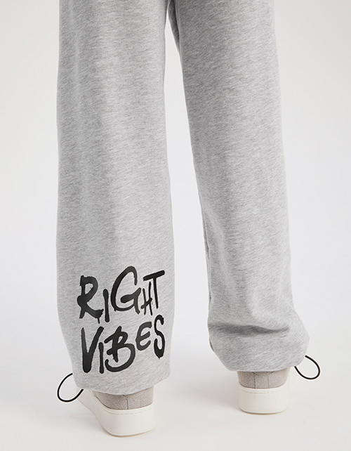 Брюки оттенка серый меланж для мальчика. Комфортная прямая модель со средней посадкой. Изделие на эластичном поясе. Низ изделия с утяжкой. Брюки дополнены карманами в швах. Изделие декорировано авторским шрифтовым принтом.