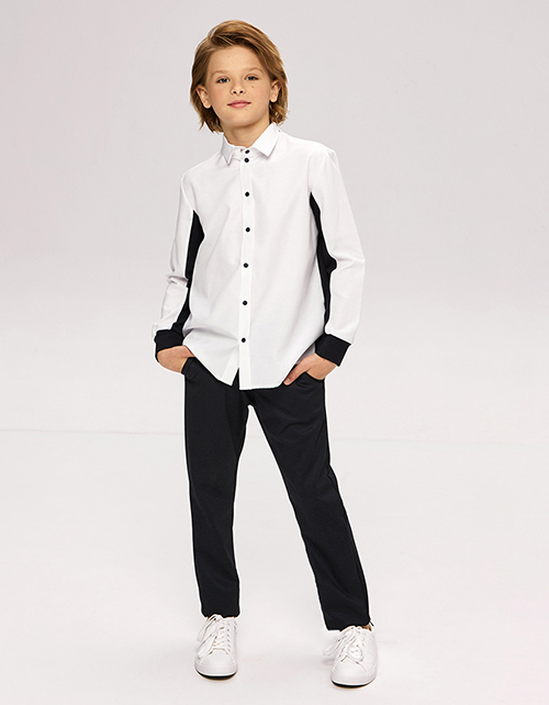 Темно-синие школьные брюки для мальчики. Комфортная модель прямого силуэта на эластичном поясе с наклонными боковыми карманами. Наружная регулировка по поясу.