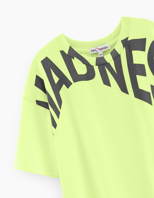 Футболка сочного оттенка киберлайм для мальчика. Модель прямого объёмного силуэта. Спущенная линия плеча. Эластичная горловина из рибаны. Футболка декорирована авторским шрифтовым принтом.
