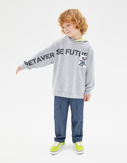Худи приятного оттенка серый меланж для мальчика. Модель прямого объёмного силуэта. Спущенная линия плеча. Глубокий капюшон с контрастной подкладкой. Манжеты и низ изделия из рибаны. Худи декорировано авторским шрифтовым принтом и нашивкой.