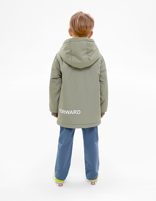 Модель прямого силуэта на синтепоне. Глубокий капюшон с контрастной подкладкой. Современная фактурная дышащая курточная ткань. Водо- и грязеотталкивающая пропитки. Нейлоновая подкладка. Манжеты на резинке. Авторская нашивка-лейбл и шрифтовой принт.