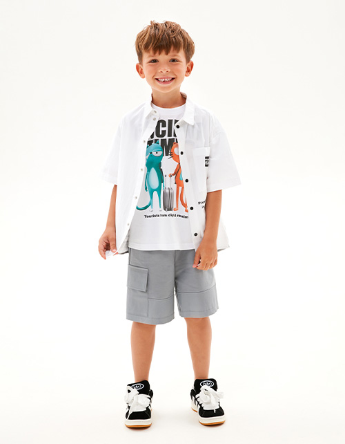 Лёгкая рубашка для мальчика. Модель прямого объёмного силуэта. Спущенная линия плеча. Накладной карман. Застёжка на кнопки. Рубашка из поплина с "жатым" эффектом декорирована авторскими принтами. Можно носить как самостоятельно, так и с белой футболкой.