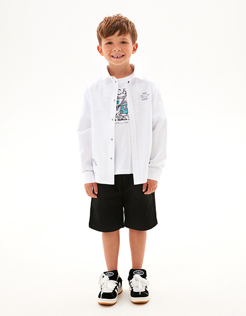 Белая рубашка для мальчика. Модель прямого силуэта. Комфортная застёжка на кнопки. Рубашка декорирована авторскими принтами с блеском.