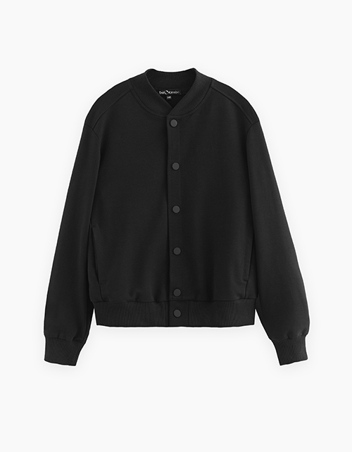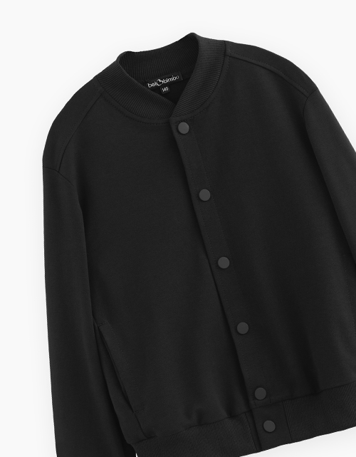 Чёрный школьный жакет-бомбер для мальчика. Модель прямого силуэта с застёжкой на кнопки. Изделие с воротником-стойкой.