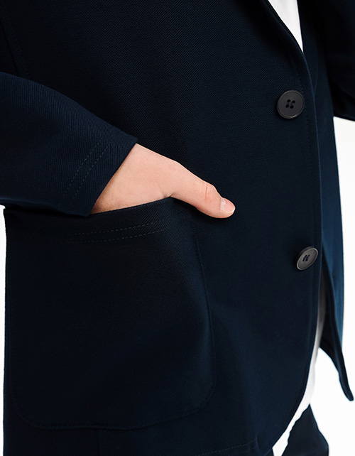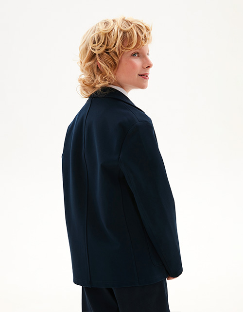 Классический пиджак тёмно-синего цвета для мальчика. Модель прямого силуэта. Застёгивается на пуговицы. Накладные карманы. Деликатный скрытый авторский декор.