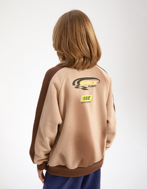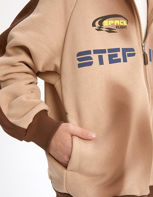Стильный жакет благородного бежевого оттенка для мальчика. Комфортная прямая объёмная модель. Манжеты и низ изделия из мягкой эластичной рибаны. Комфортная застёжка на молнию. Изделие дополнено карманами. Жакет декорирован авторскими принтами.