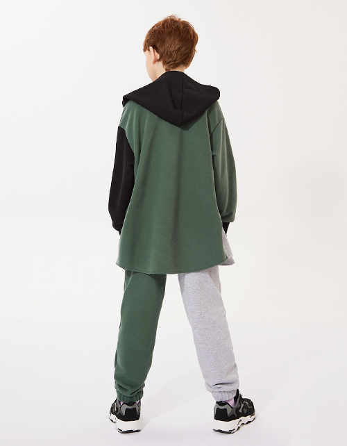 Трендовый жакет-рубашка в стиле колор-блок для мальчика. Комфортная модель с капюшоном из футера и застежкой на кнопки. Жакет декорирован нашивкой и принтом. Модель выполнена из футера с браш-эффектом, что делает жакет мягким и бархатистым, повышая износостойкость.